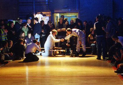 Bei den hochgezüchteten Rennmaschinen empfiehlt sich vorsichtigste Handhabung. "The dark Reign" vom Team "Microsport" wird hier an den Start gebracht.
